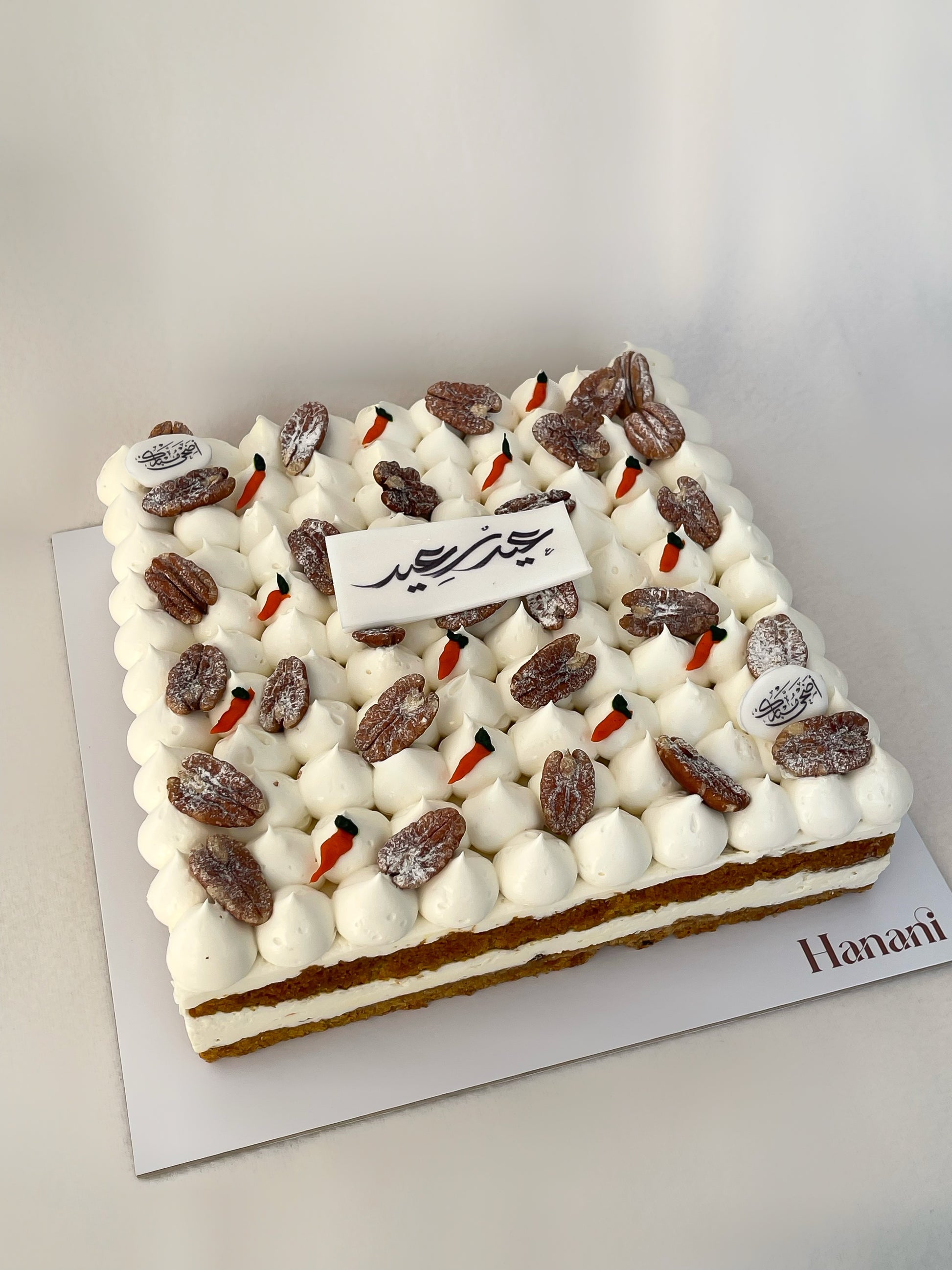 With a moist texture. Made with a carrot sponge, Topped with a heavenly combination of cream cheese and caramel condensed frosting, and the delightful crunch of pecan nuts, sprinkled on top for a delightful nutty flavor.