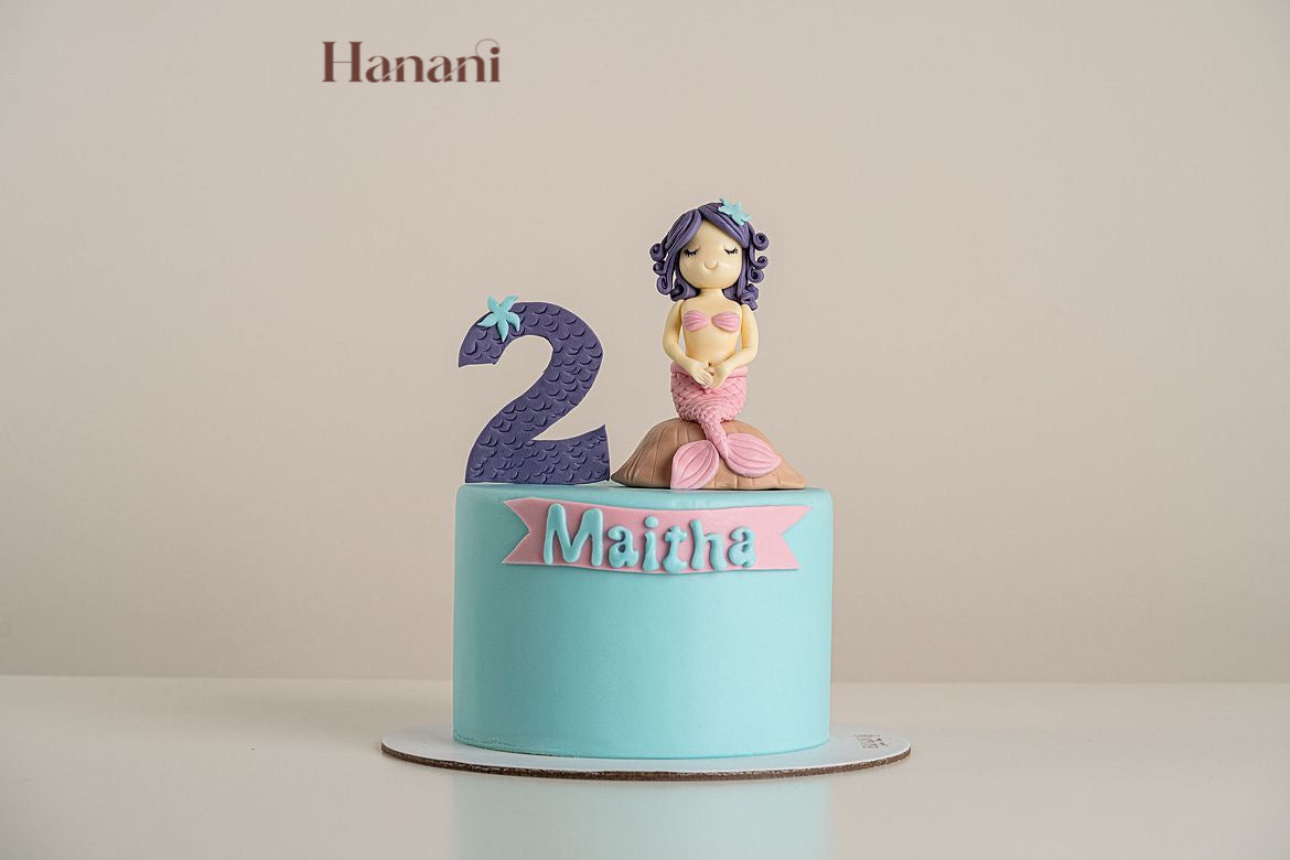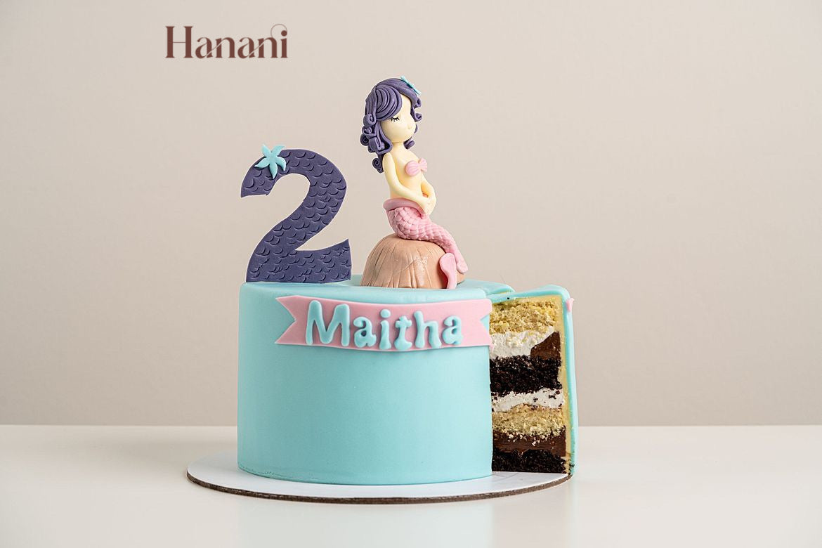 The Mermaid cake is captivating, featuring a stunning 3D mermaid figurine gracefully perched on top. What adds a personalized touch is the inclusion of a name and number, making the cake truly special.