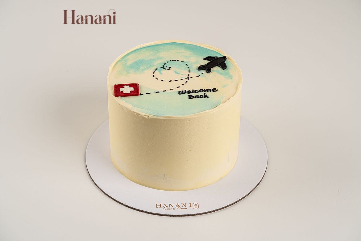 The 'Welcome Back' cake, featuring a designed airplane and flag made from cream, is a delicious treat and a heartfelt expression of joy and celebration for the return of a dear one.